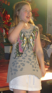 Kathryn and some of her friends were in a girl group called "Jungle Babes", as this part of Dorothy's journey on the Yellow Brick Road took place in the "Celebrity Jungle" - yes, I know, it's not part of the story that I know either. But it means the children get to sing and dance - and have fun!! So here's a picture of Kathryn - it's not a great photo (the lighting in the hall was awful), but this is my "proud mum" moment - so there!!