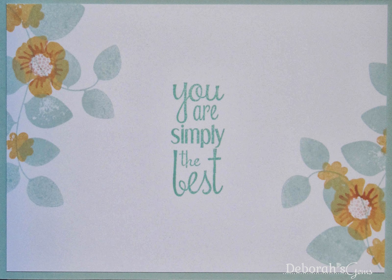 I used the sketch from Clean & Simple Stamping - FTL#285, although I've turned the sketch through 90° to make a landscape style card. I made the base from Soft Sky and cut a panel of white card to go on top. I stamped the leaves directly onto the panel and the flowers onto white card. The flowers are really easy to make, simply stamp the base colour (pale gold) and the detail in a darker colour (dark gold) add the centre and then I fussy cut the flowers. I attached the smaller flowers directly to the card and used dimensional gel for the larger flowers. I finished the front with a bold sentiment - I love the font used in the word happy. For the inside I cut another panel of white card, stamped some flowers down the sides and added a sentiment in the middle.